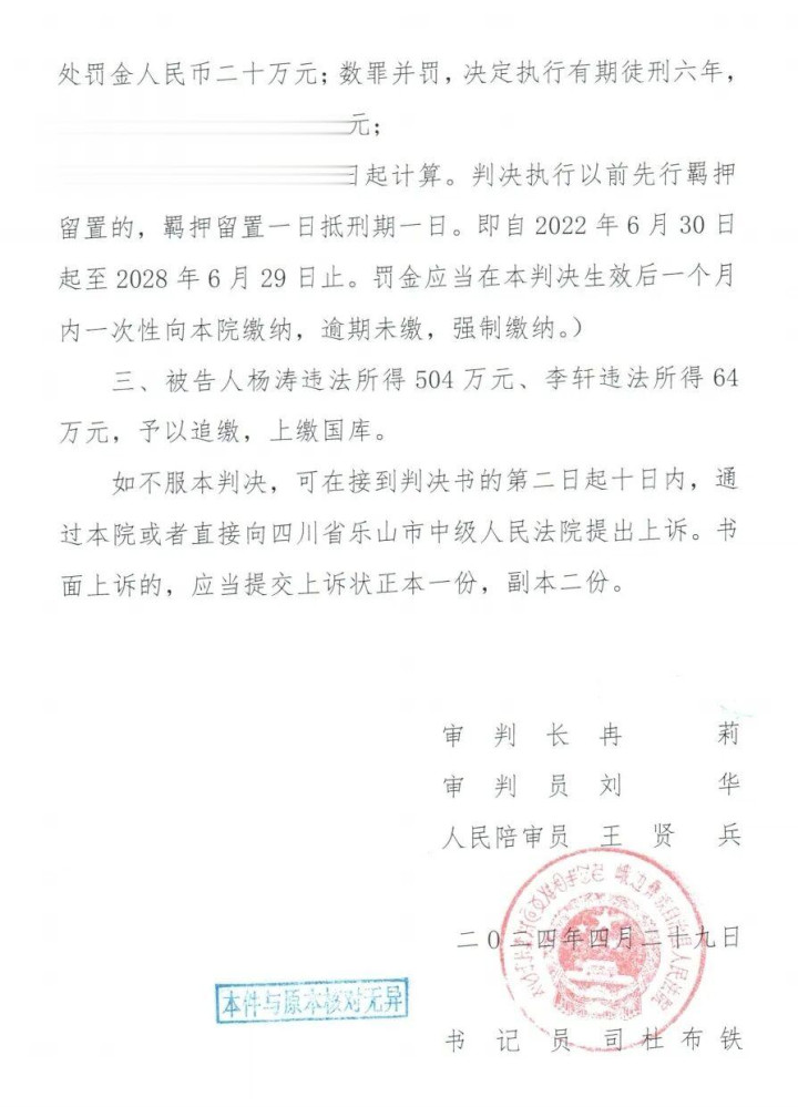 2024年4月,峨边县法院作出刑事判决,对杨涛以违法发放贷款罪判处有期徒刑八年,以受贿罪判刑十年,数罪并罚,决定执行有期徒刑十五年;同样犯违法发放贷款罪、受贿罪的李轩被判刑六年。两名被告人均被判处罚金,追缴违法所得。