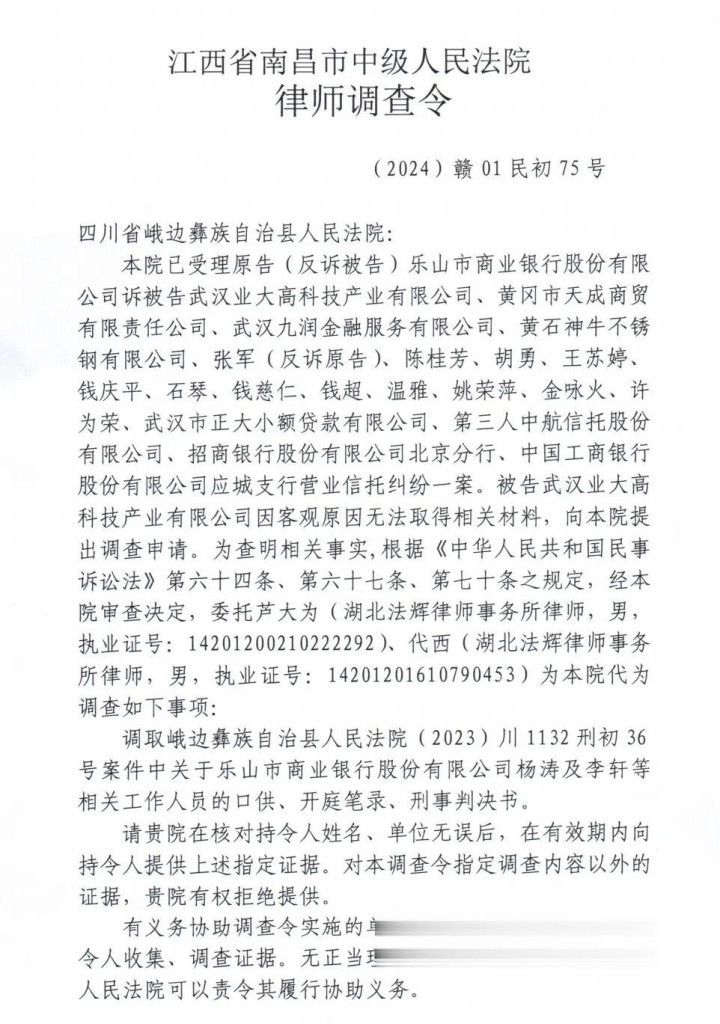 南昌中院调取有关乐山市商业银行刑案资料的调查令(部分)。