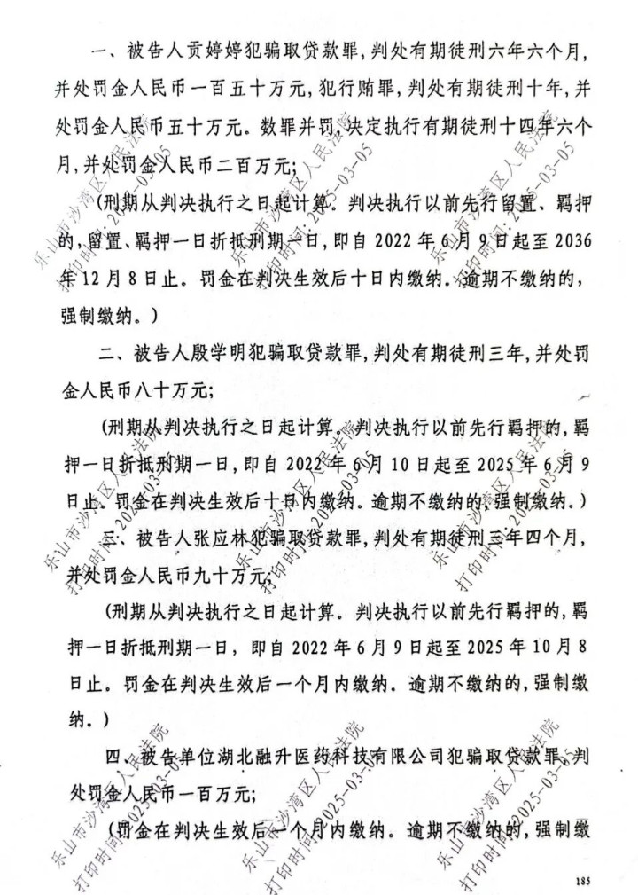 2024年10月,沙湾区法院作出一审判决,以骗取贷款罪、行贿罪“数罪并罚”,决定对贡婷婷执行有期徒刑十四年六个月;被告人殷学明、张应林、陈碧元均犯骗取贷款罪,分别被判处有期徒刑三年、三年四个月、三年;所有被告人以及被告单位湖北融升公司均被判处罚金。
