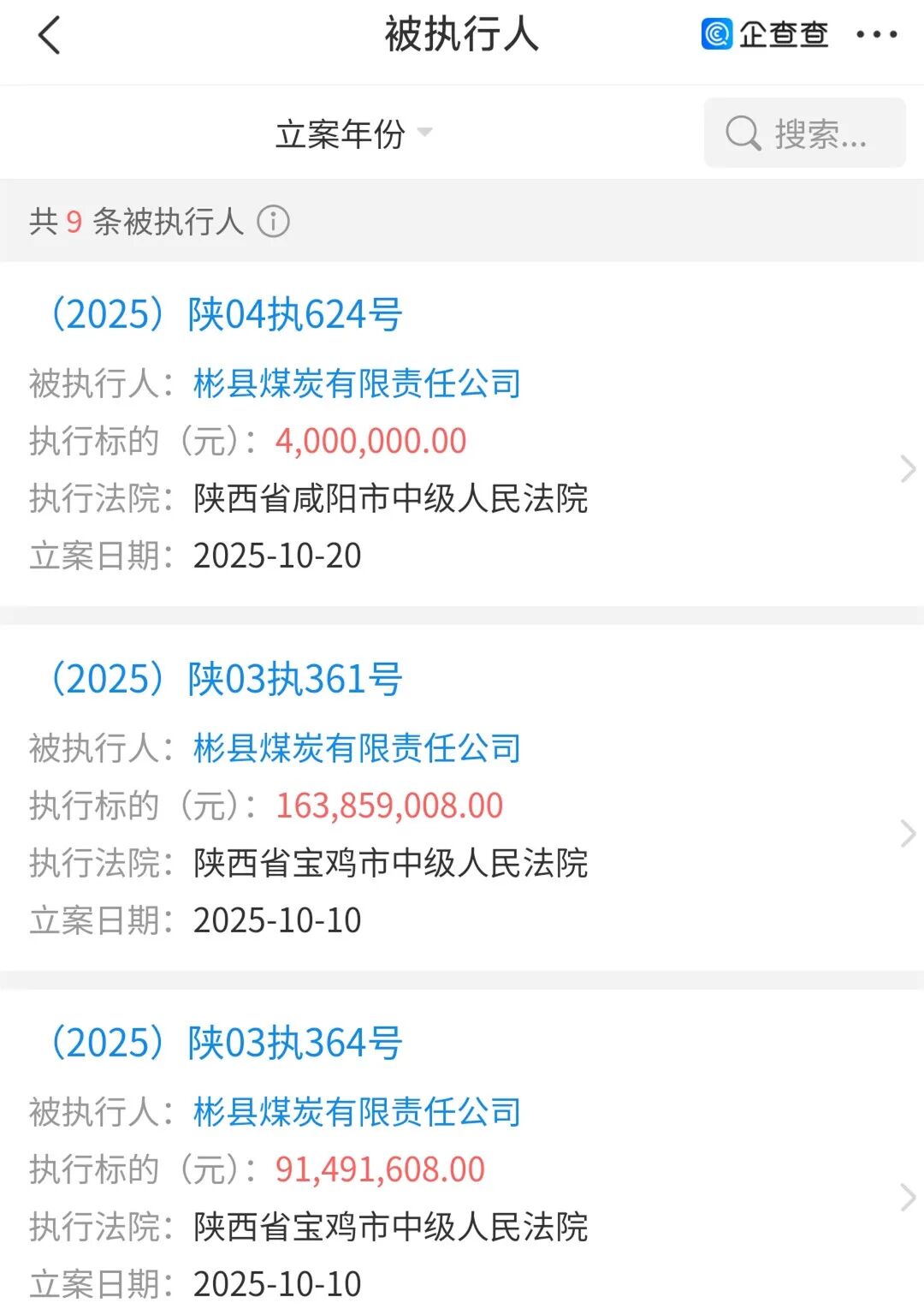 2025年10月10日,陕西省宝鸡市中级人民法院在同一天立了六次案,立案申请人包括多家银行和多家企业,分别对彬县煤炭公司执行5.21亿元、3.65亿元、1212.88万元、3.67亿元、9149.16万元、1.64亿元。